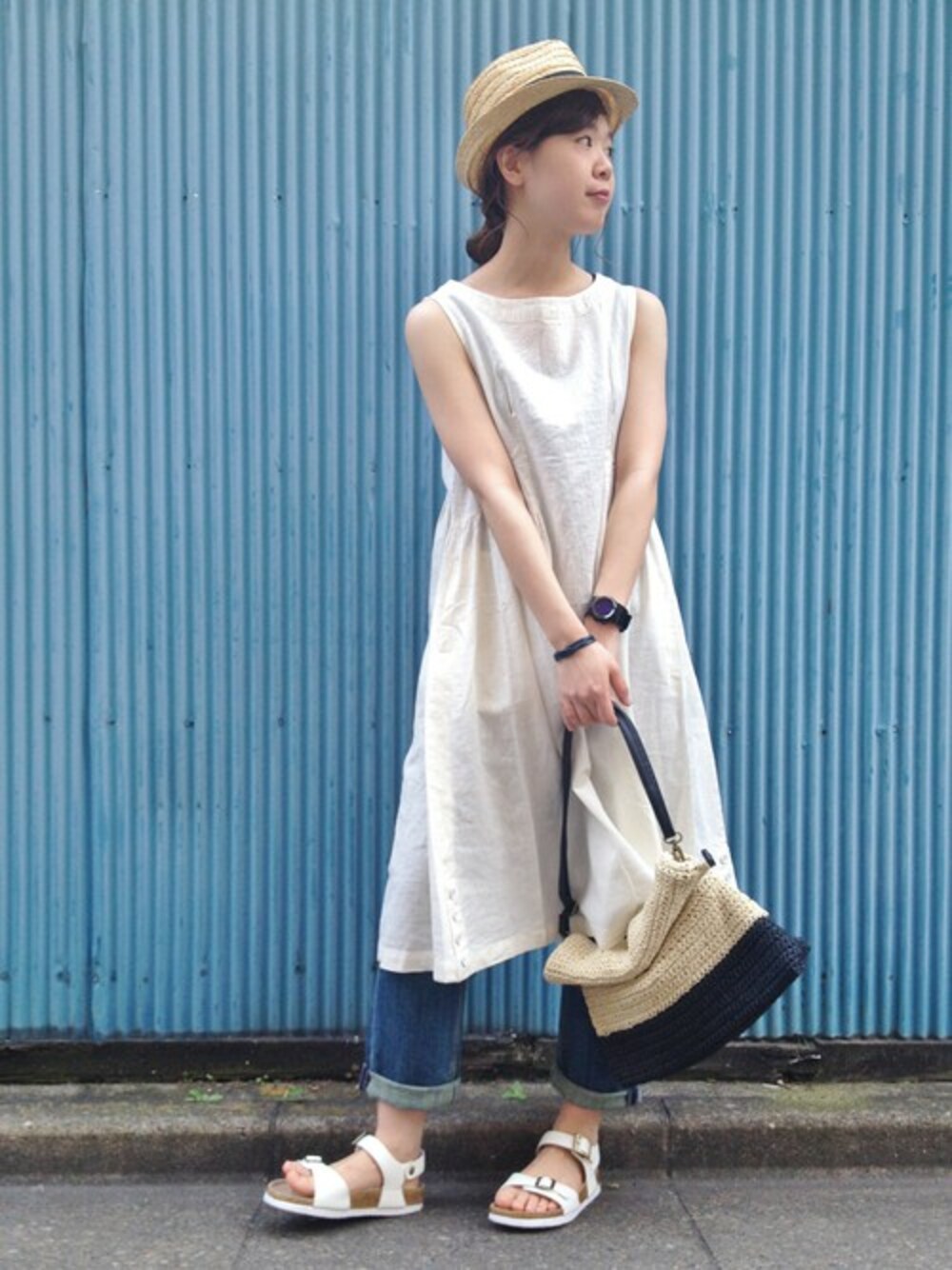 ノースリのゆるワンピに淡いデニムを合わせて 軽めにコーデ! 小物で夏らしく仕上げました(^_^)/★
