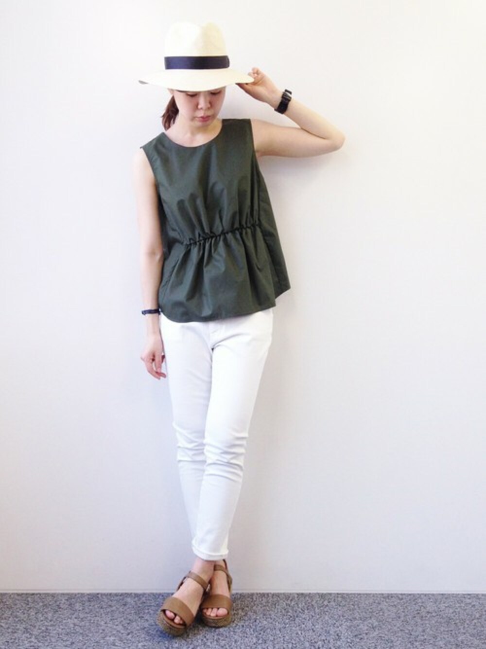 ウエストにたっぷり入ったギャザーが可愛いノースリブラウス。 シンプルなのでカジュアルにも、スタイリッシュにも馴染みます。