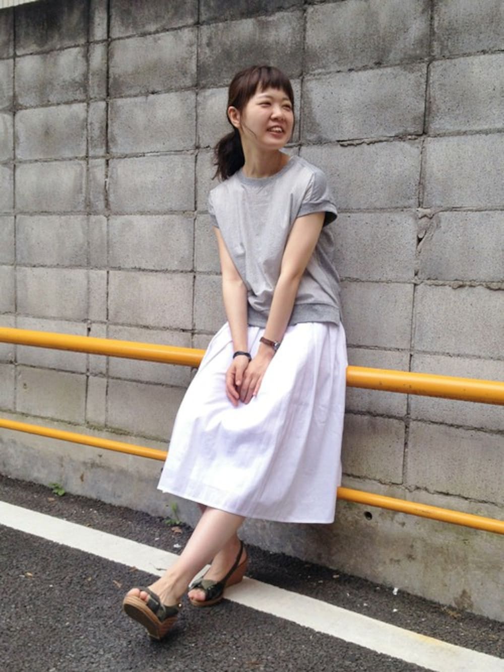 コンパクトなプルオーバーに ギャザースカートを合わせてバランスコーデ! カモフラサンダルでポイントを付けました。 スカートはタックで広がっているので ヒップラインを隠し、女性らしさを出してくれますよ(^_^)/