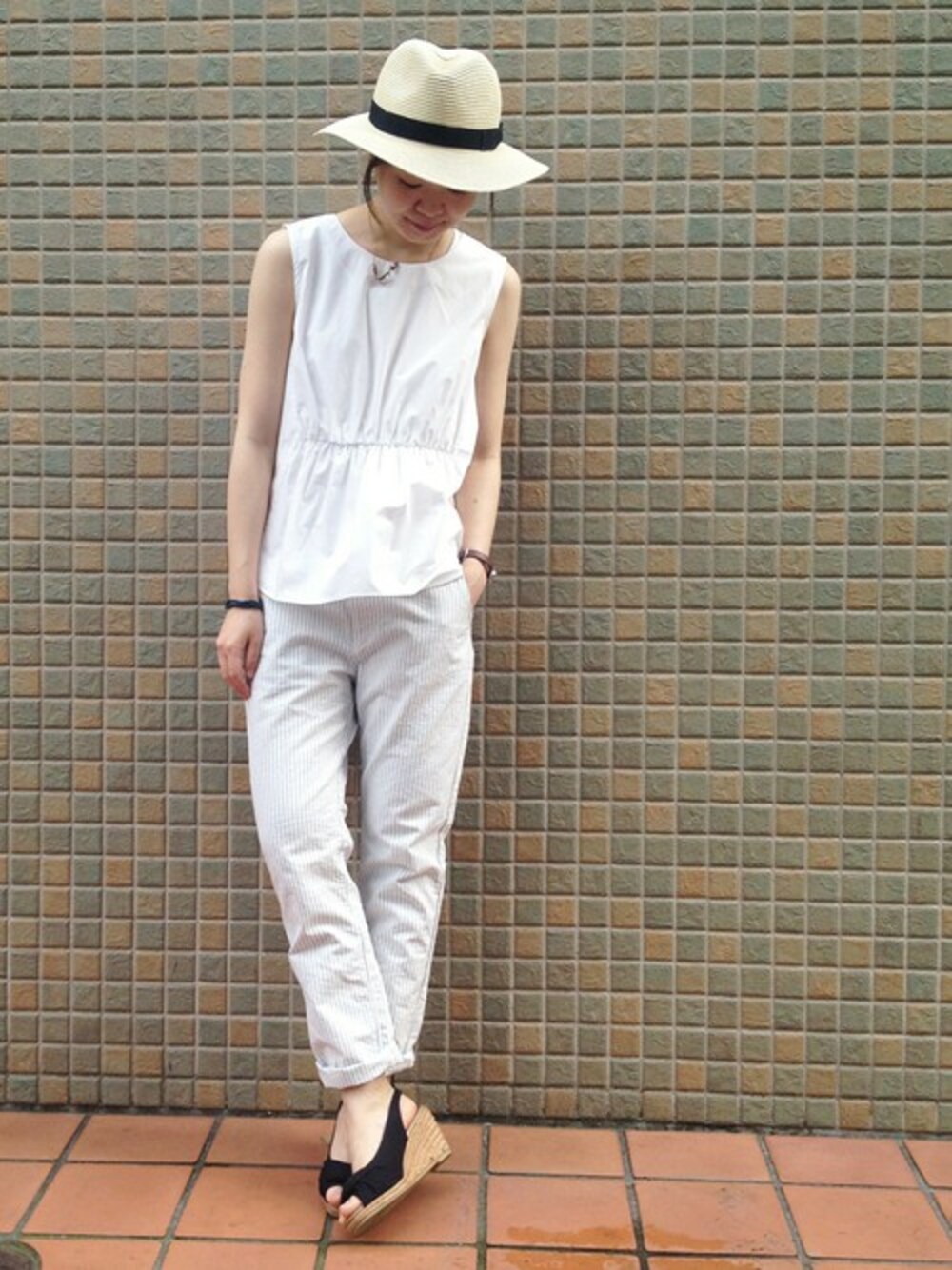 ウエストのたっぷりギャザーがポイントのノースリブラウスは パンツでもスカートでもバランス良く着れるのでとてもおススメ。 白を基調に季節感を出しました!