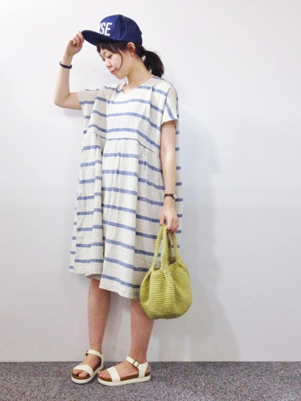 おかだのワンピース「コットンリネンボーダーVネックワンピース 」を使ったコーディネート