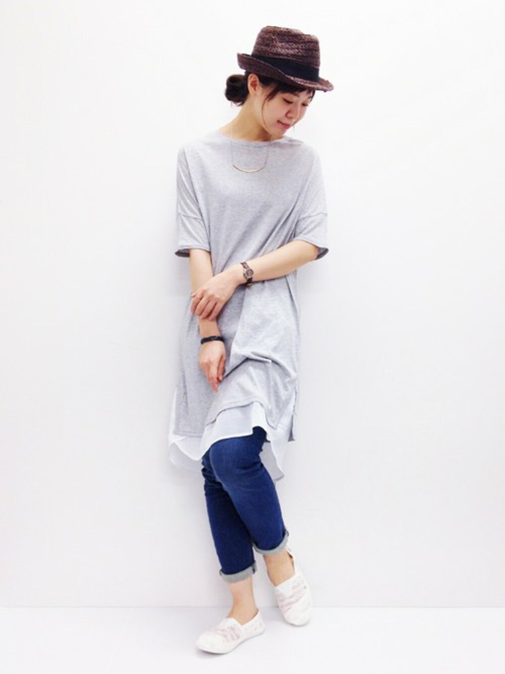カット地に裾に布帛のついた、カジュアルながらに フェミニンさも出してくれるワンピース。 ワンマイルウェアとしても活躍します! デニムを合わせてカジュアルにコーデしてみました(^_^)/~