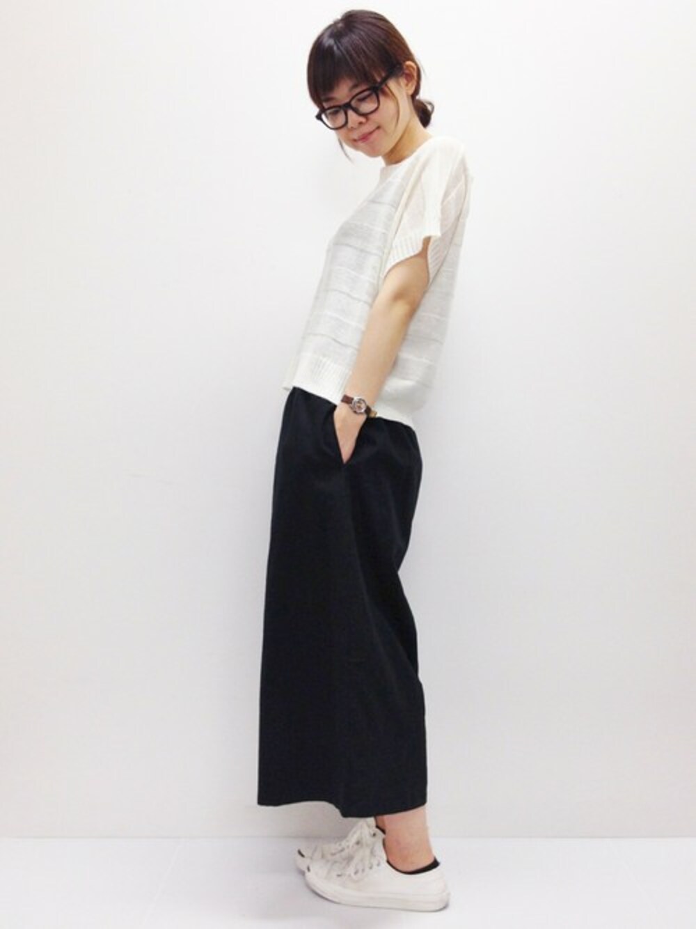 サマーニットにガウチョのシンプルコーデ。 スニーカーのはずしがポイントです!