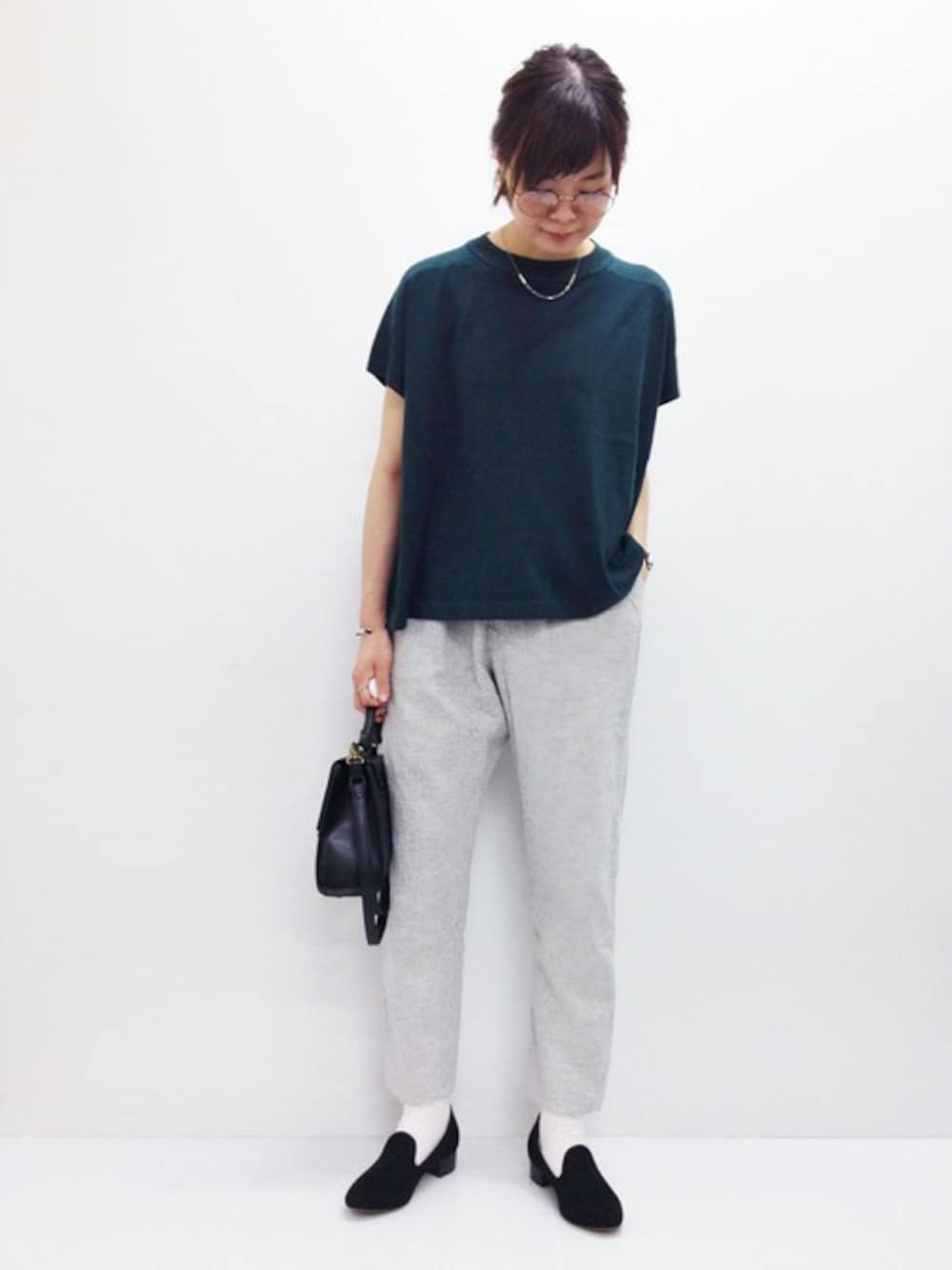 岡田イチオシコーデ! 新作ニットは形が絶妙!つまり気味の首元、ゆるいシルエット、丈感。 ぼすっと大き目のパンツでゆるくスタイリング。 小物をキレイなものをチョイスしてバランスを★