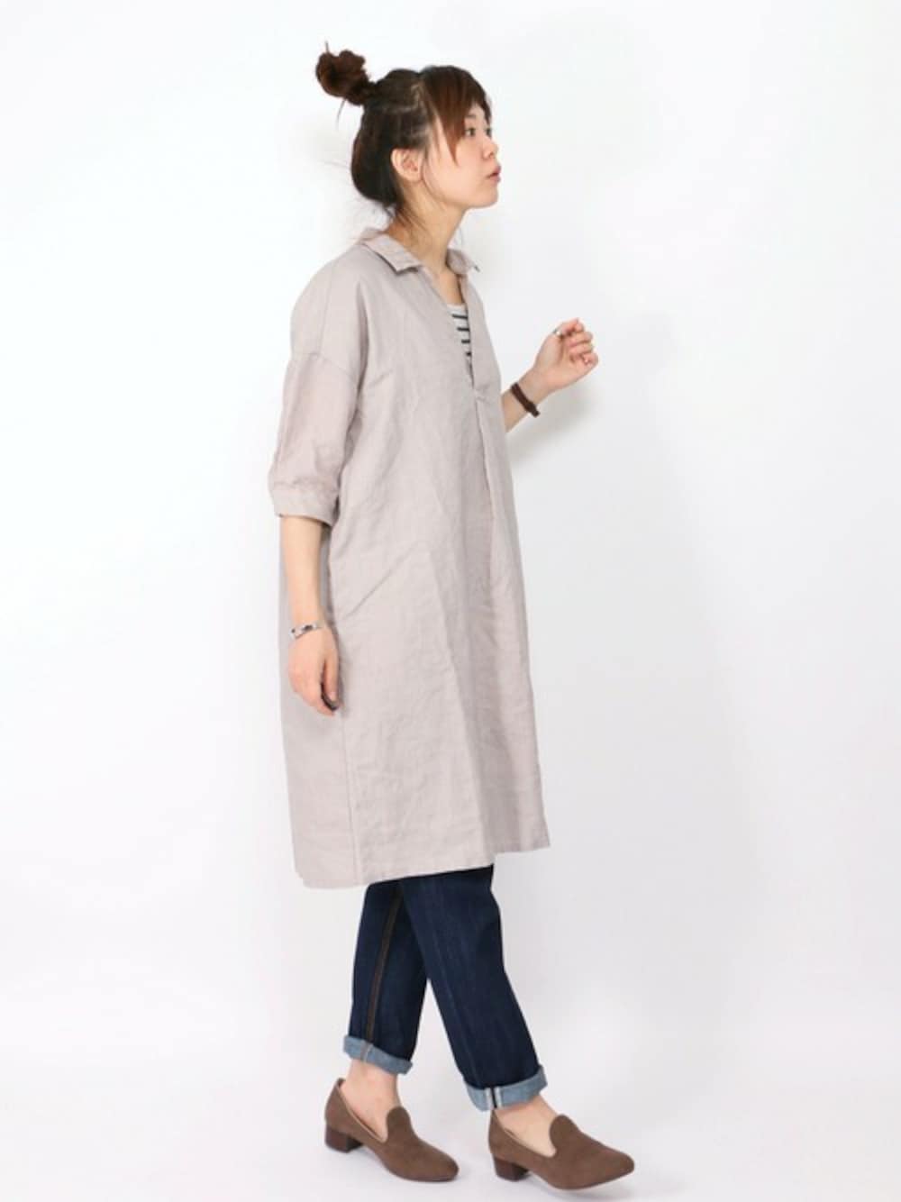 しっかりリネン生地なので、自然な立体感と雰囲気の出せるワンピース。 デニムを合わせてカジュアルに着てみました。