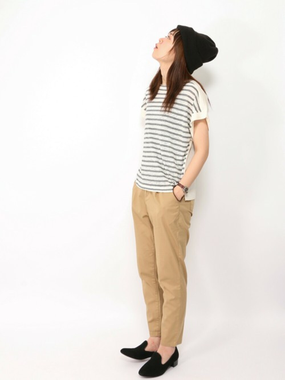 ボーダーT×スリムパンツのシンプルカジュアルコーデ! カジュアルになりすぎないよう、足元はパンプスで(^O^)