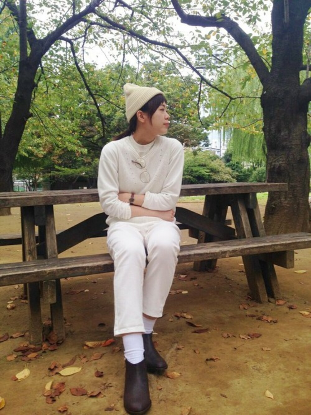 秋のオールホワイトコーデ。 ニットやこげ茶のブーツで季節感を出すと可愛い♥ プルオーバーは身頃がニット、袖と背面はカット地なので コーデに馴染みやすい1枚。