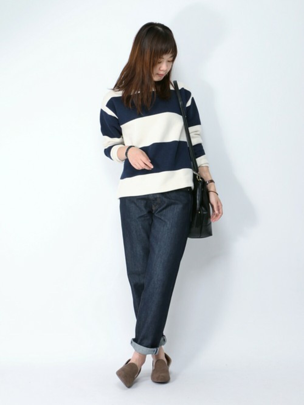 インパクト大の太ボーダープルオーバー。 ボーイフレンドと合わせつつ、パンプスやきれいなバッグで大人なバランスを★