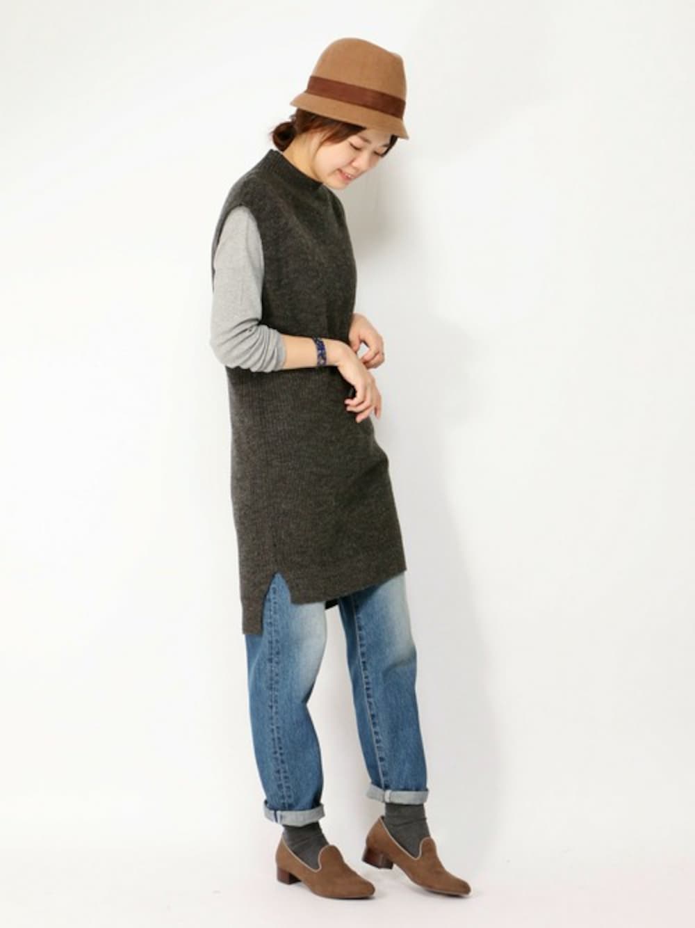 おかだのベスト「7Gアクリルウールバルキーハイネックロングベスト 」を使ったコーディネート