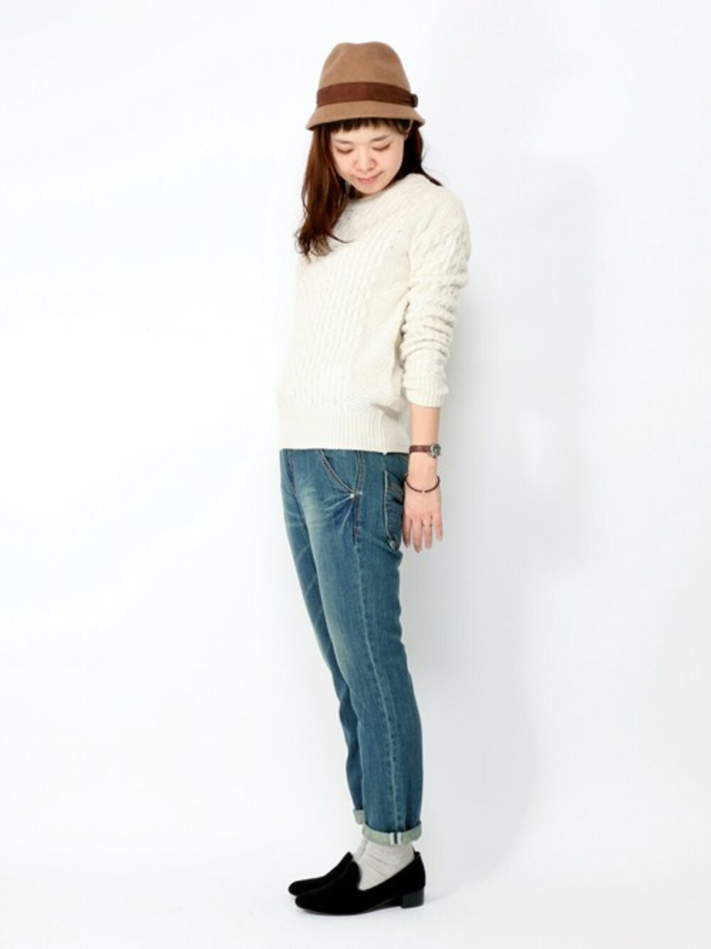 ホワイトニットにデニムのシンプルなコーデには キャメル小物がよく映えます。 コモノの合わせ方で大人っぽさを+!