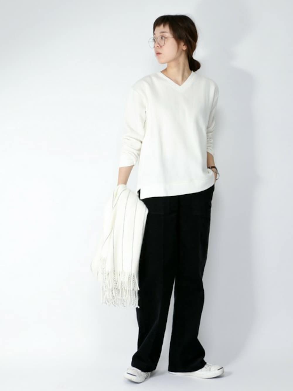 スウェットだけどVネックだからカジュアル過ぎないバランスが最高に好き! コーデュロイのワイドパンツで季節感をプラスして♥