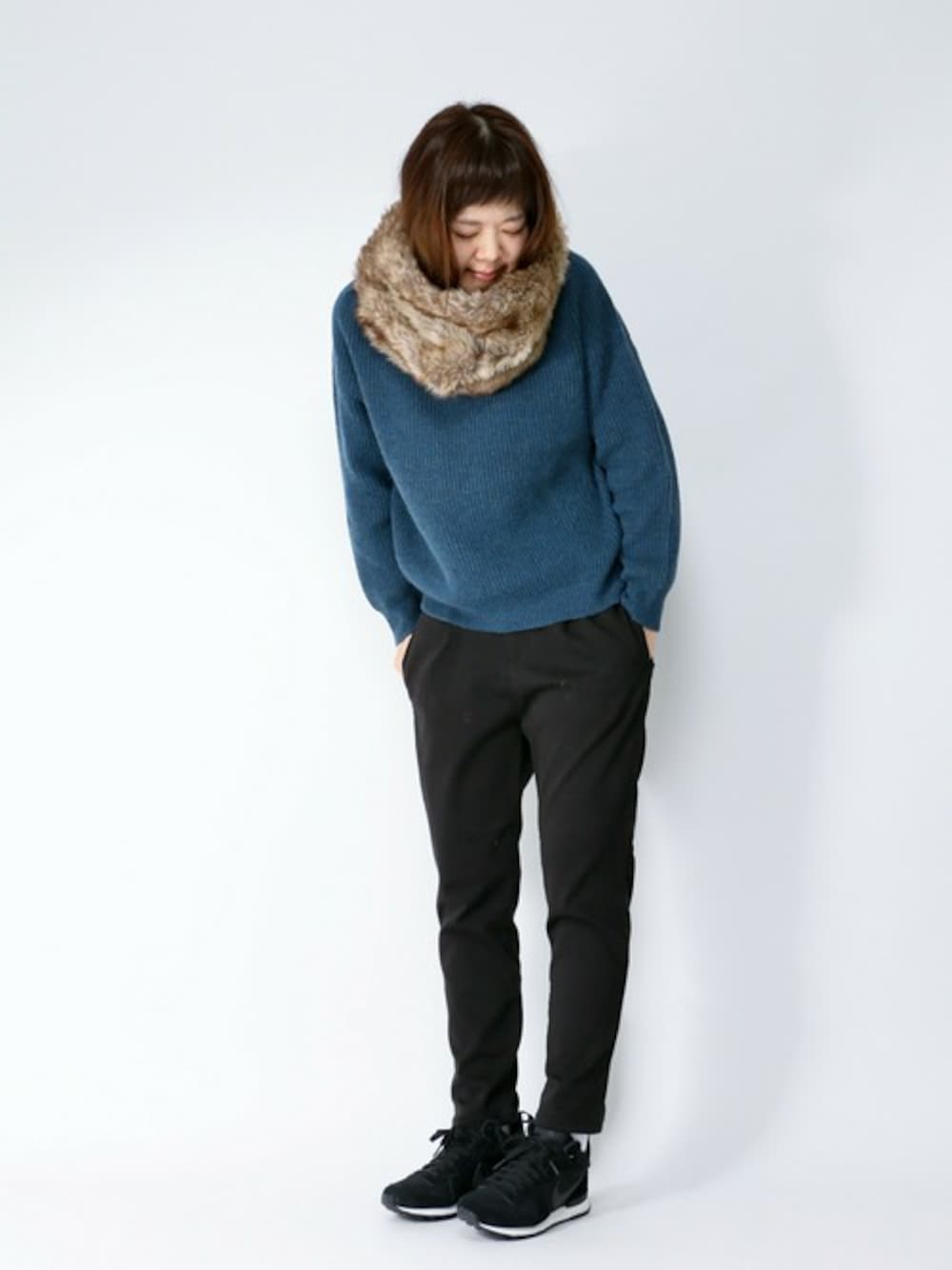 季節感のある重たいブルーが可愛いニット。 シンプルながら、コンパクトな丈感、ぽてっとした形が絶妙です♥ 他はブラックでまとめつつ、ファー付ストールをポイントに。