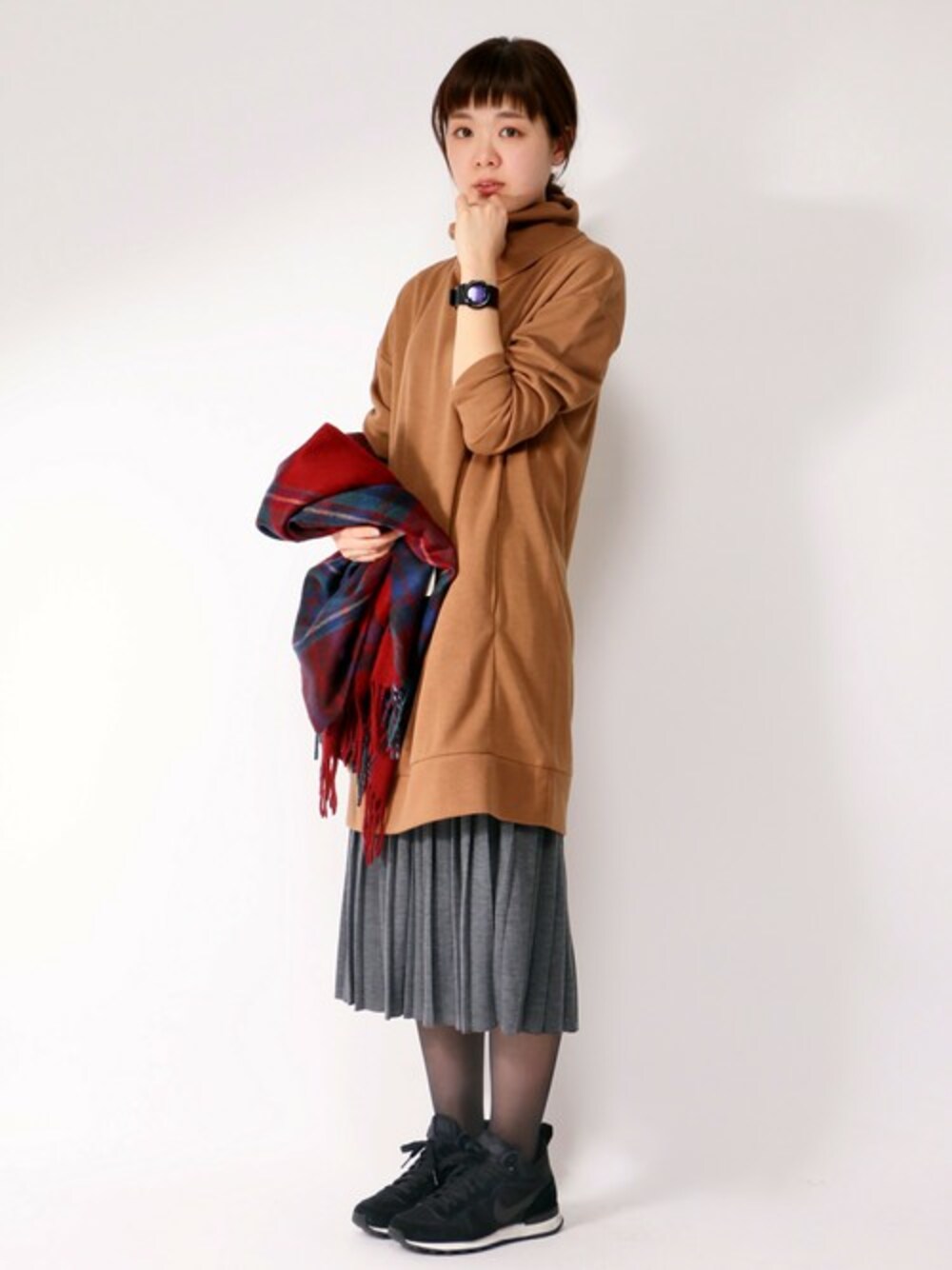 トレンドの重ためバランスコーデ! 赤いチェックストールを冬らしいポイントに(^_^)/
