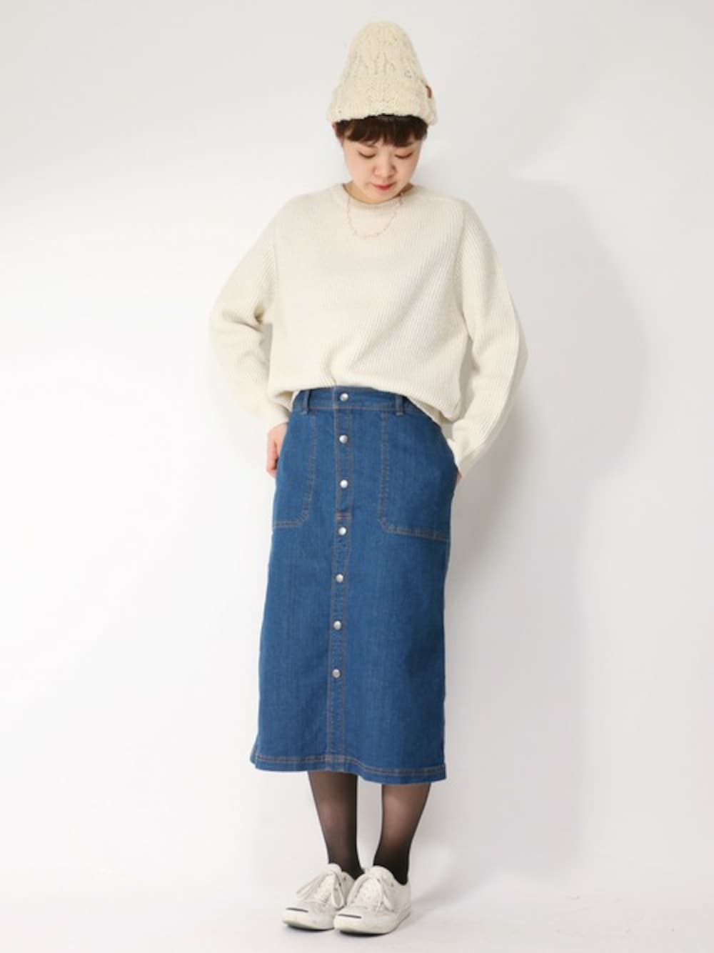 かわいいデニムスカートが入荷しました★ パチパチとめる前ボタン式。 太過ぎず細ずぎずなシルエットがバランスとりやすいです。