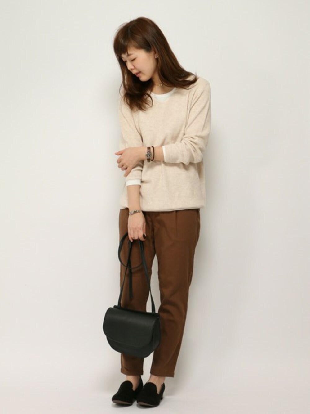ブラウン系でまとめた大人カジュアルコーデ。 シンプルになりすぎないよう、INにTシャツを着てカジュアルさをプラス。