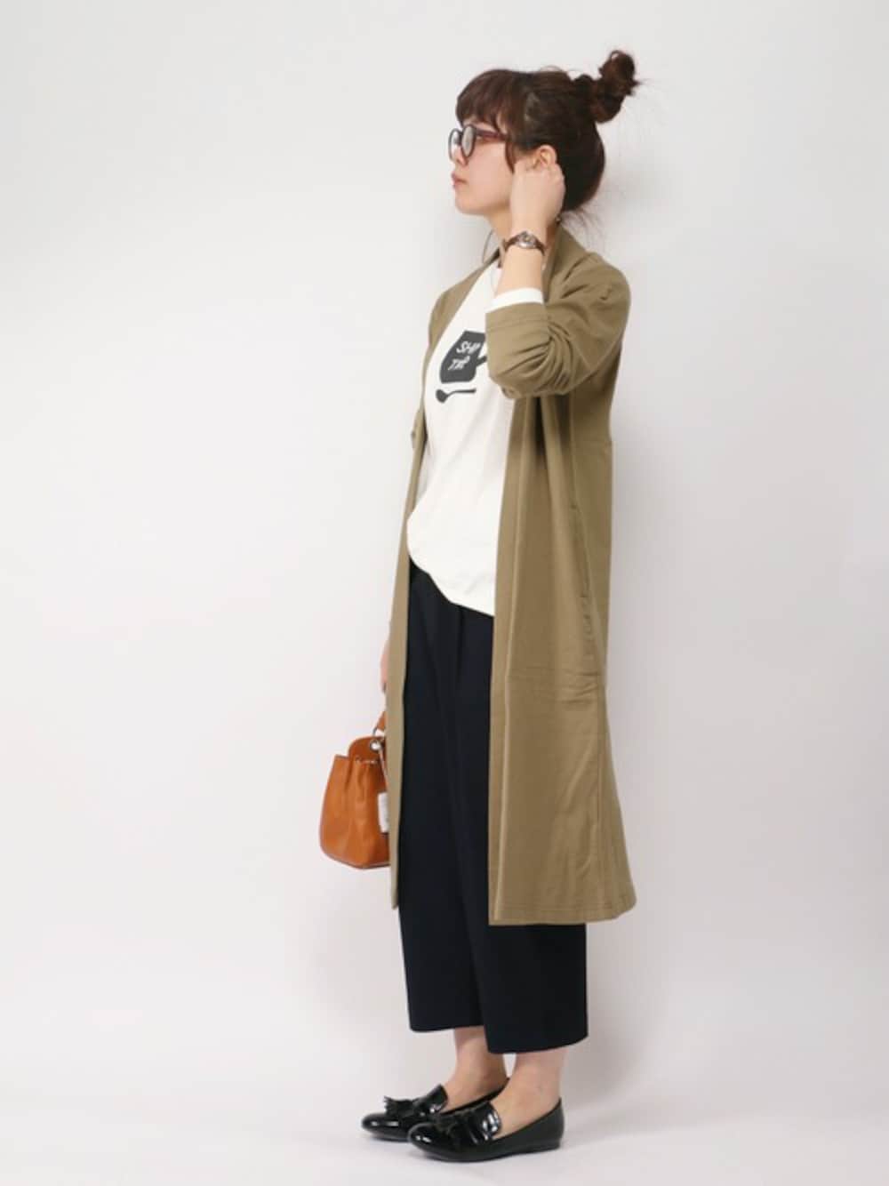カット素材の着心地の良いロングカーディガン。 そのままゆるーくラフにしたかったのでTシャツを。 だらしなく見えないよう、素材なきれいなパンツとローファーで調整を。