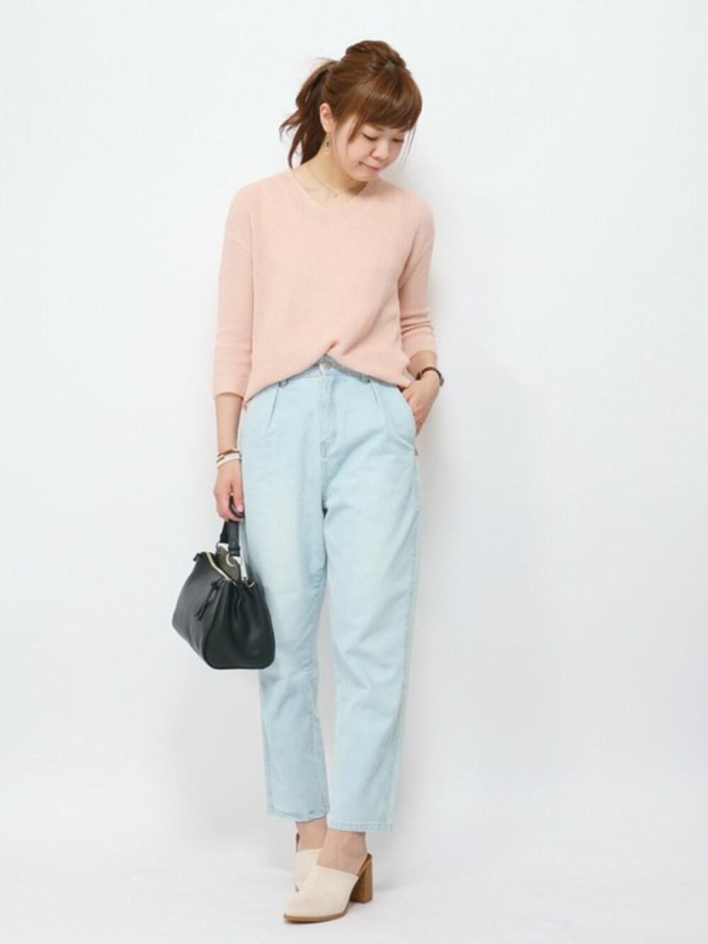 春らし~いベージュピンクのニット。 半分リネンなので涼しげに見えます。 薄いデニムをあわせてとことん春見えに。