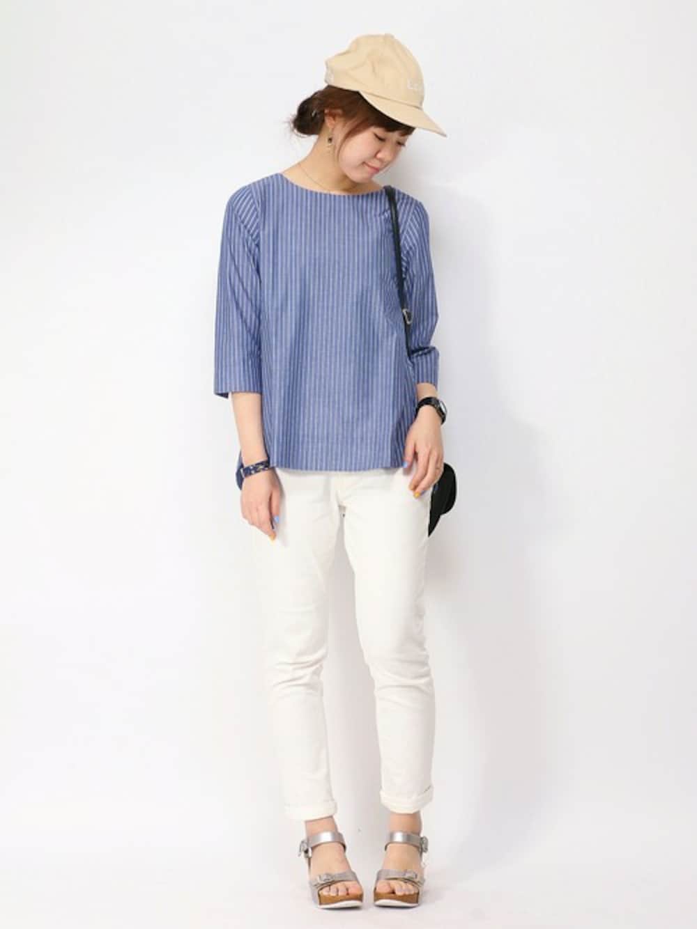 前後差のある爽やかなブラウスに 白パンを合わせて爽やかな色合いに。 ポイントでキャップをかぶってみました(^O^)