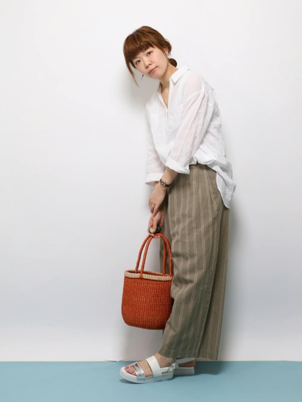 ゆるめの白シャツにストライプのワイドを合わせて ちょっと女らしさを出しつつ サンダルやオレンジのかごバッグでカジュアルダウンしました。 シャツは絶妙なゆるさで細見パンツともよく合いますよ。 ¥3,024-というスペシャルプライスです!