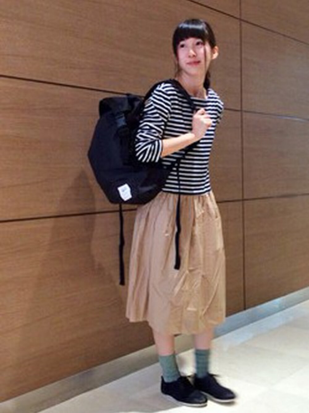 爽やかなボーダーをあしらったボートネックのカットソーと、 ギャザー使いでふんわりした印象が女性らしいスカートをドッキングしたワンピース♪ バックパックを背負ってカジュアルにまとめました。