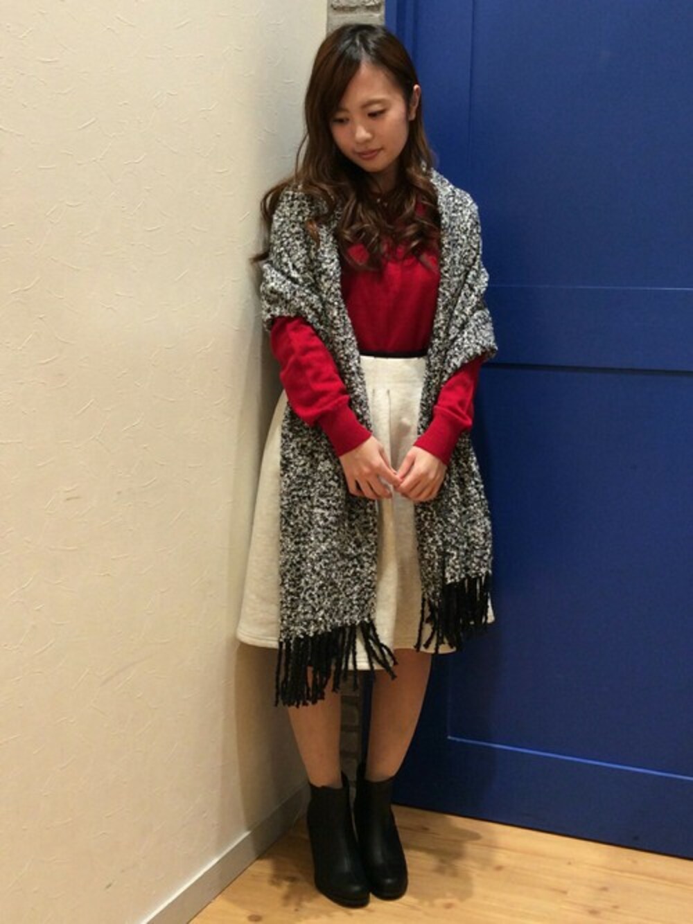 鮮やかなレッドのニットにミモレ丈スカートを合わせたフェミニンなスタイリング。 ニットはトレンドのちびハイネック。トップスインも今年らしい着こなしです。 マフラーが暖かいのはもちろん、スカートも裏毛仕様なので見た目に反してあったかコーデです♪