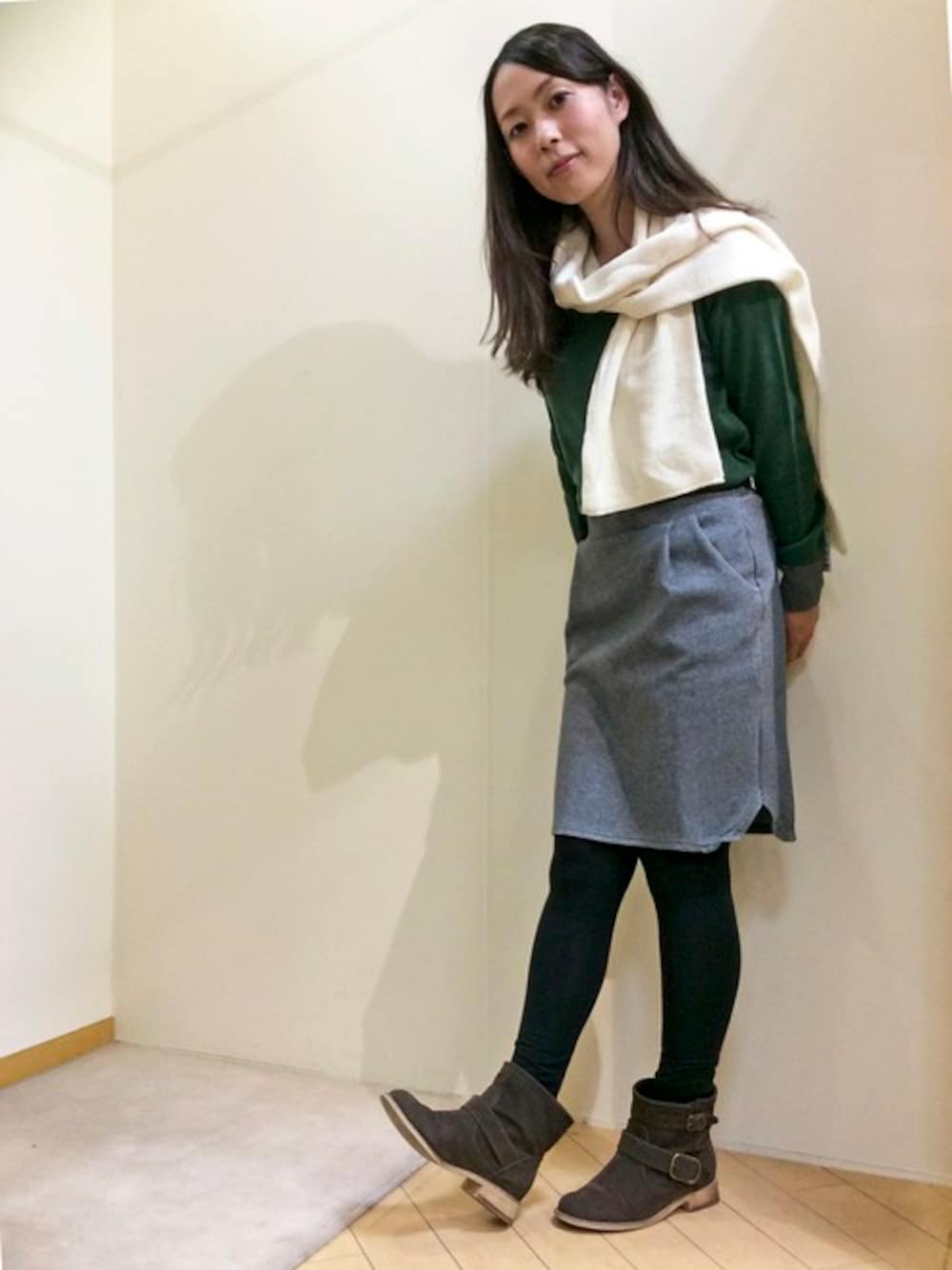 ニットのトップスをスカートインしトレンドを反映させたスタイリング。 ニットは発色の良いグリーンがポイント。袖・裾がバイカラーになっており1枚で着用してもきまるアイテム。 スカートは人気をスウェット地。ラウンドさせた裾のカットがデザインポイントです。