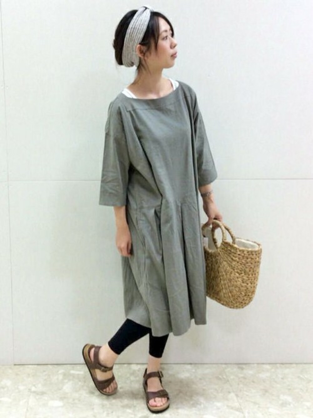 らくちんリラックスコーディネートです♪ ワンピースは、リネンのサラッとした着心地とレーヨンのなめらかな肌触りで暑い夏にもうれしい素材。 ふんわりとしたデザインなので、ヘアはヘアバンドをアクセントにすっきりまとめました。