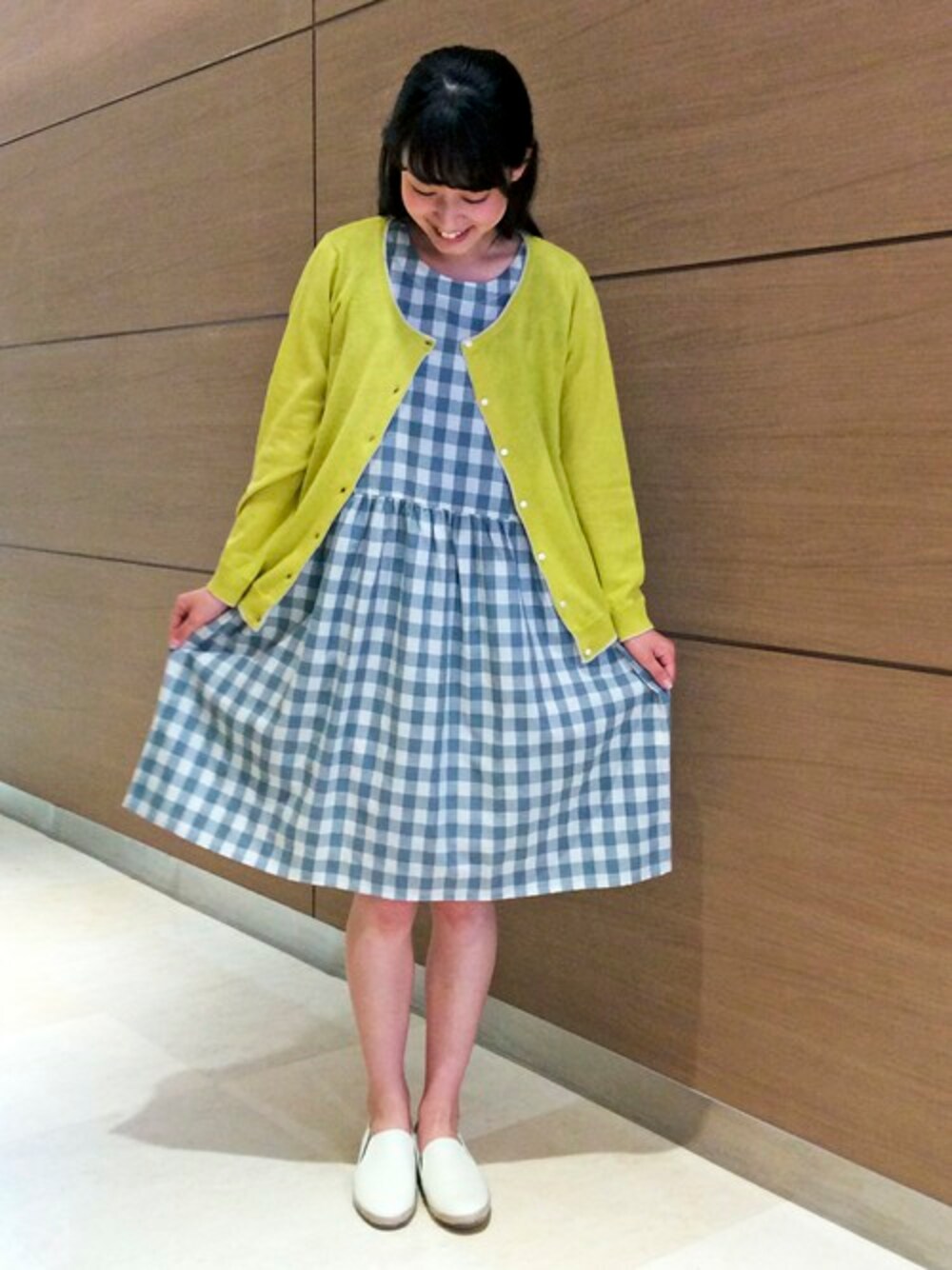 休日のおでかけコーディネート。 大きいチェック柄のAラインワンピに、トレンドのイエローカーデをさらりと羽織ってポイントに♪ 足元は夏素材のシンプルなスリッポンをあわせました。