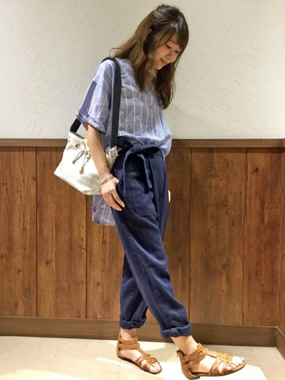 さわやかなブルーコーデ。 首元すっきりのバンドカラーシャツをトップスインであわせました。 夏素材の小物をあわせれば休日スタイル完成♪
