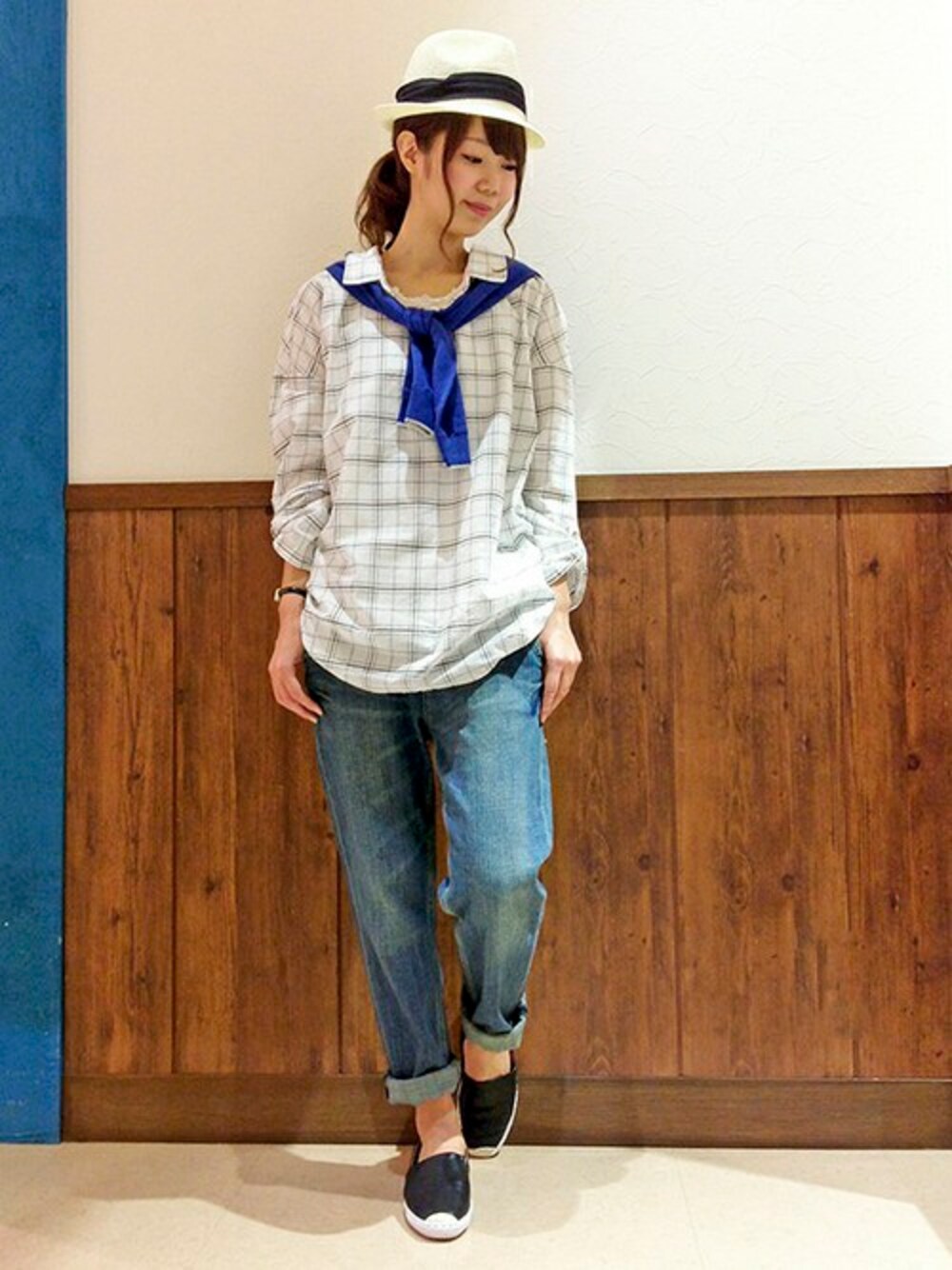 クロプド丈のデニムを使ったおとななSTYLE。 洗いざらしの雰囲気が魅力のスキッパーシャツは、インナーを変えるだけで様々なスタイルを楽しむことができますよ。 肩掛けしたカーディガンの、鮮やかなブルーがアクセントカラーです。