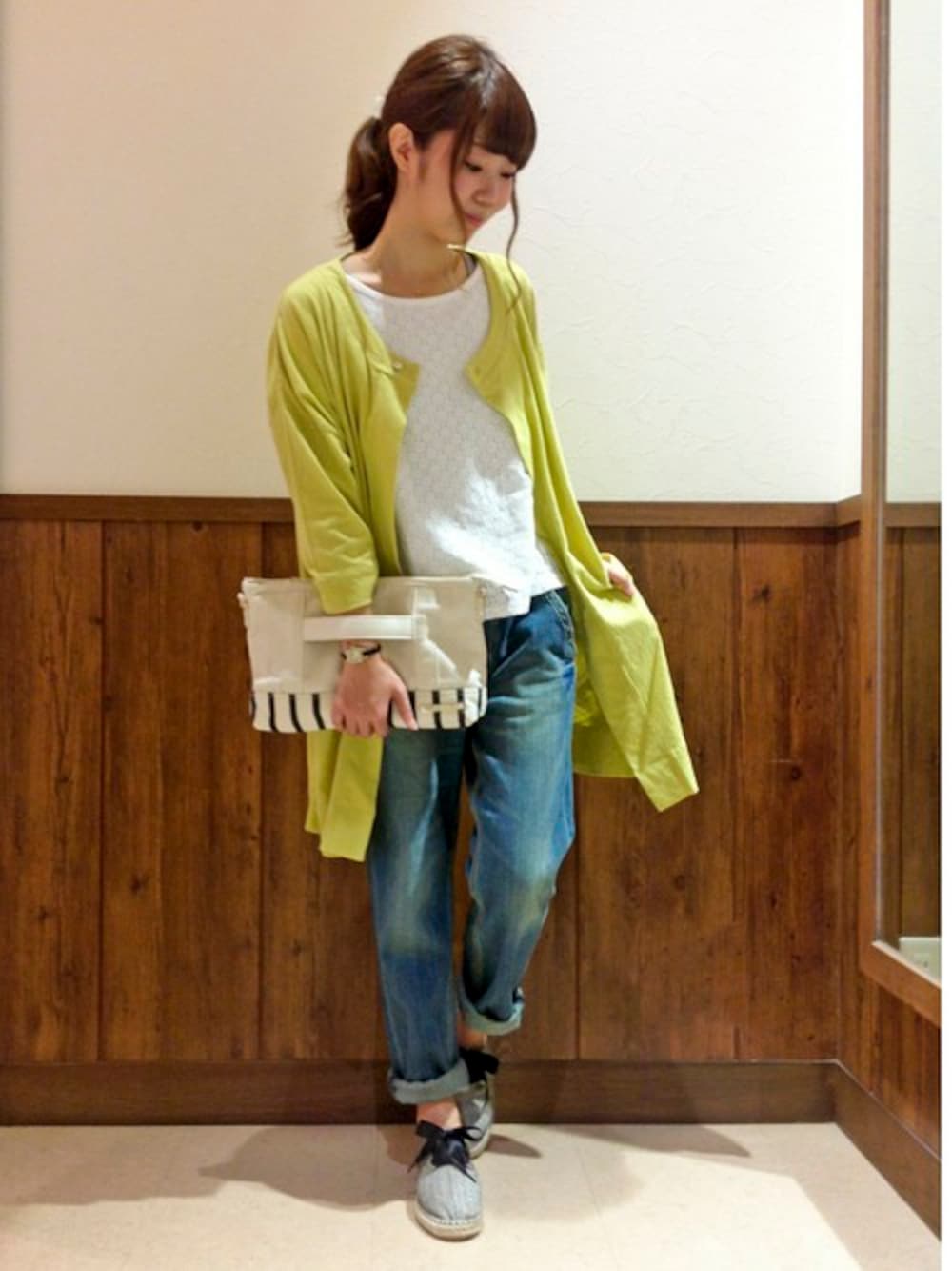 トレンドのロング丈カーディガンをコーディネート。 ひとつボタンに、くたっとした可愛いポッケ。そしてドロップショルダーとこだわりのデザインです。 イエローカラーは今年トレンドのデニムを好相性です♪