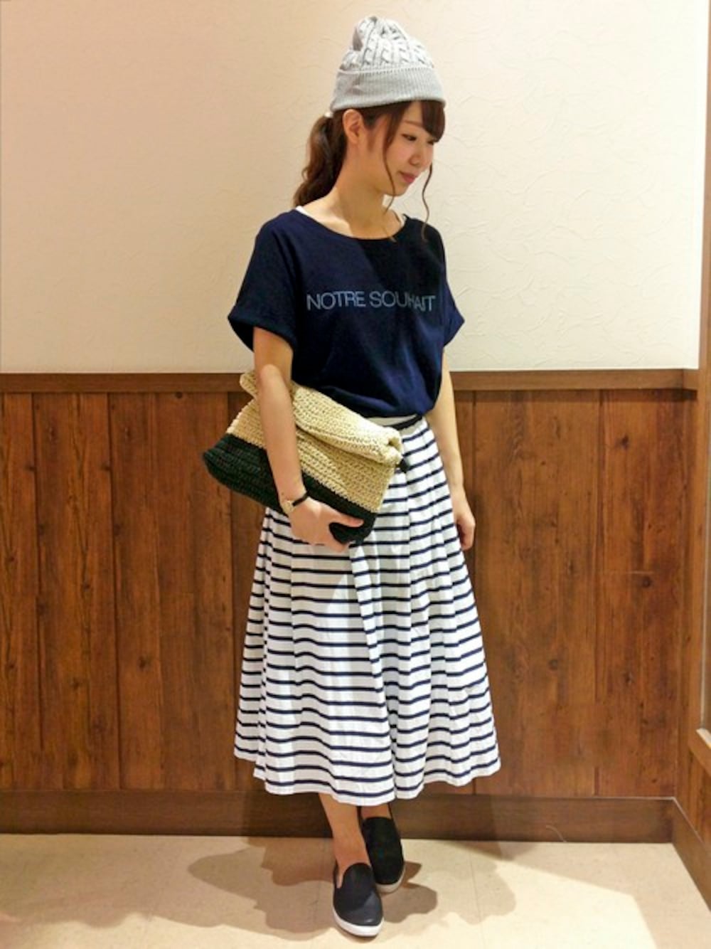 この夏大人気のインディゴ染めのプリントTは、色に深みがポイントです。 裾に入ったタックで、ちょっぴり女性らしいシルエットになります。 ニット帽やスリッポンなどボーイズライクなアイテムには、スカート合わせが◎
