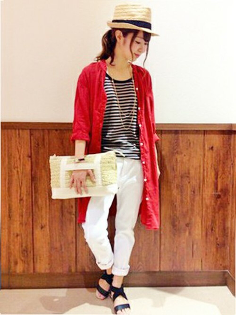赤のチュニックシャツが新鮮! モノトーンとミックスさせた大人コーデ。 おもくなりがちな赤も、トレンドの白をベースに天然素材の小物をあわせると軽い印象になりますよ♪
