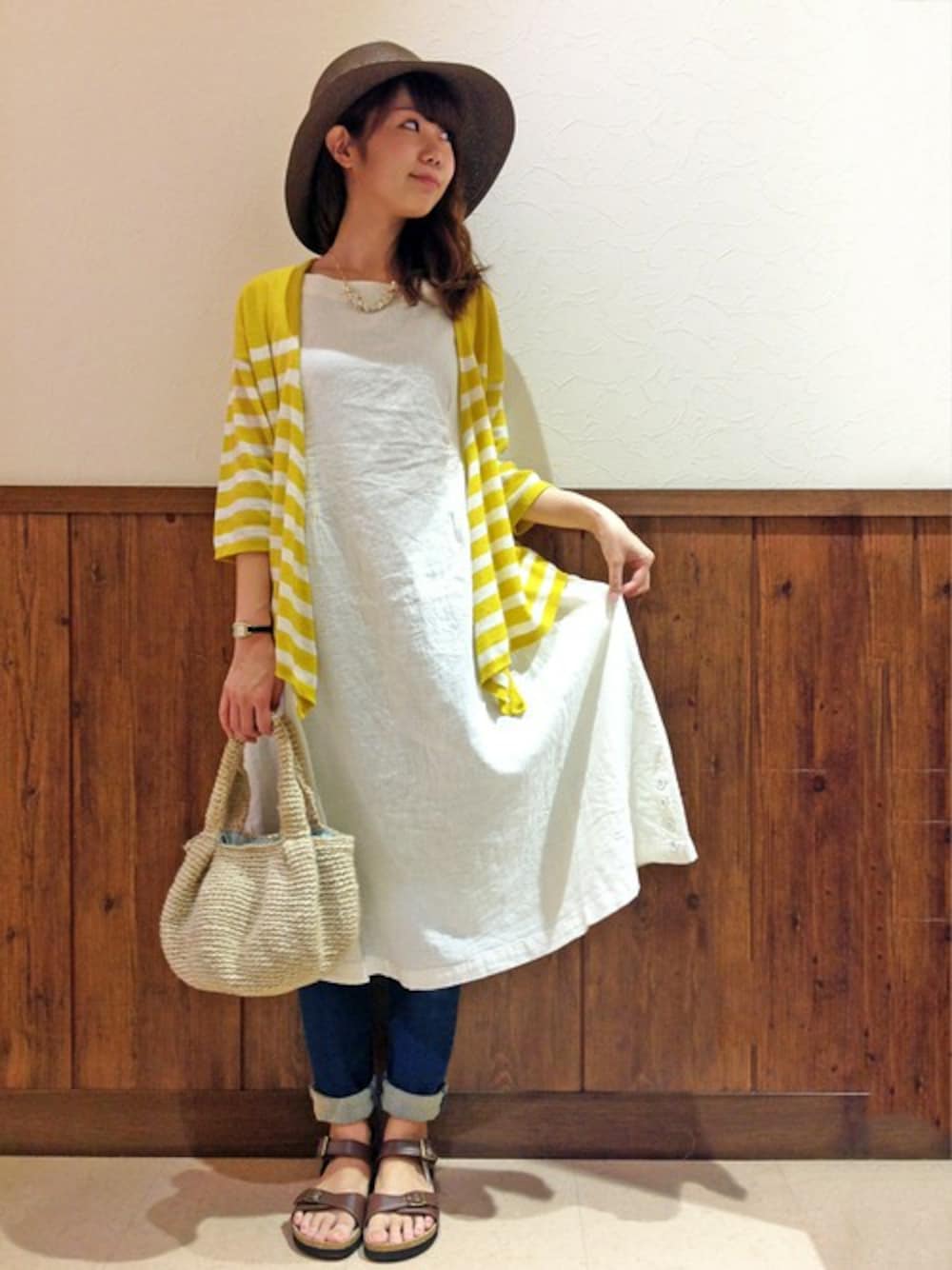休日におすすめのリラックススタイル。 トレンドの白のノースリワンピに、カジュアルなパンツや小物をあわせたミックスコーディネートです。 シンプルな色使いなので、イエローをポイントにつかって全体を明るい印象に♪