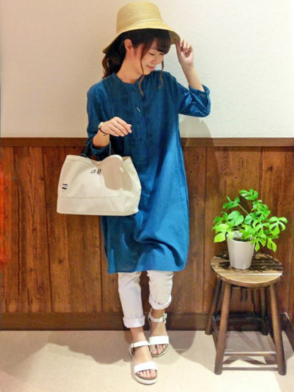 ブルー×ホワイトのさわやかコーディネートです。 スタンドネックの綺麗色シャツワンピは薄手で清涼感のあるコットン素材でさらっとした着心地♪ レギンスパンツをロールアップさせて、足元を夏らしくすっきりまとめました。