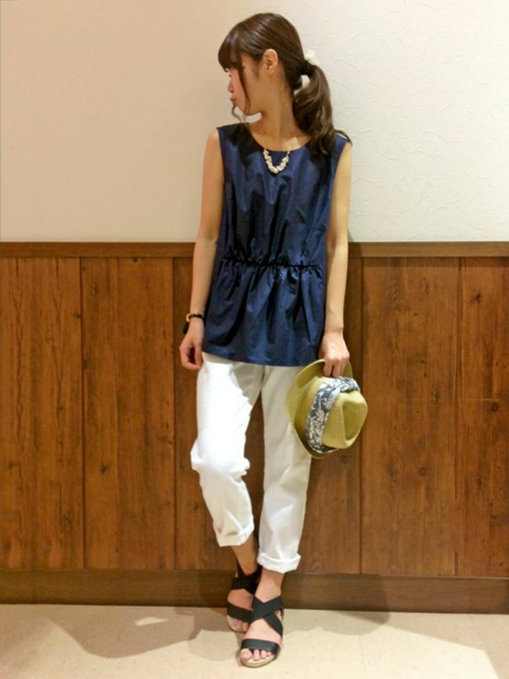 大人の女性を意識したキレイめパンツコーディネートです。 トレンドのノースリブラウスは、ウエスト部分にギャザーが入ってキュッとスタイル良く見せてくれます♪ トップスのシルエットがふんわりなので、細身のパンツとあわせるのがおすすめです。
