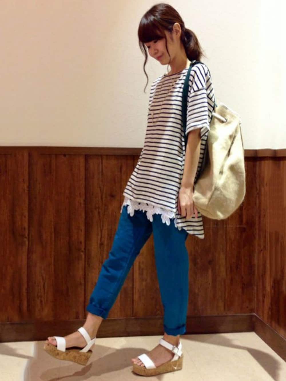 夏らしいブルー×ホワイトのコーディネートです。 トップスは、ゆるっとしたボーダーTの裾からレースタンクをみせて、シンプルなコーディネートのポイントに♪ シルエットのきれいなテーパードパンツは、コットンリネン素材で暑い季節にもさらりとした着心地です。 ジュート素材のバッグやサンダルをあわせると夏らしさがUPします!