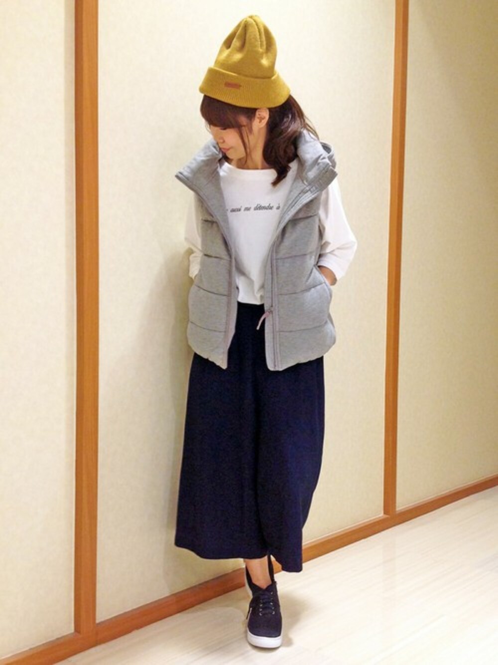 秋のオトナカジュアルコーディネートです。 レイヤードが楽しくなるこの季節にピッタリの中綿ベストは、部分的に綿の量を調節することでほどよいボリューム感を保ちながらも着ぶくれしないシルエット。 そのため、カット素材ながらカジュアルになりすぎずスッキリ着こなせます。 人気のガウチョパンツは、デニムのようなインディゴ染めで今年らしくまとめました♪