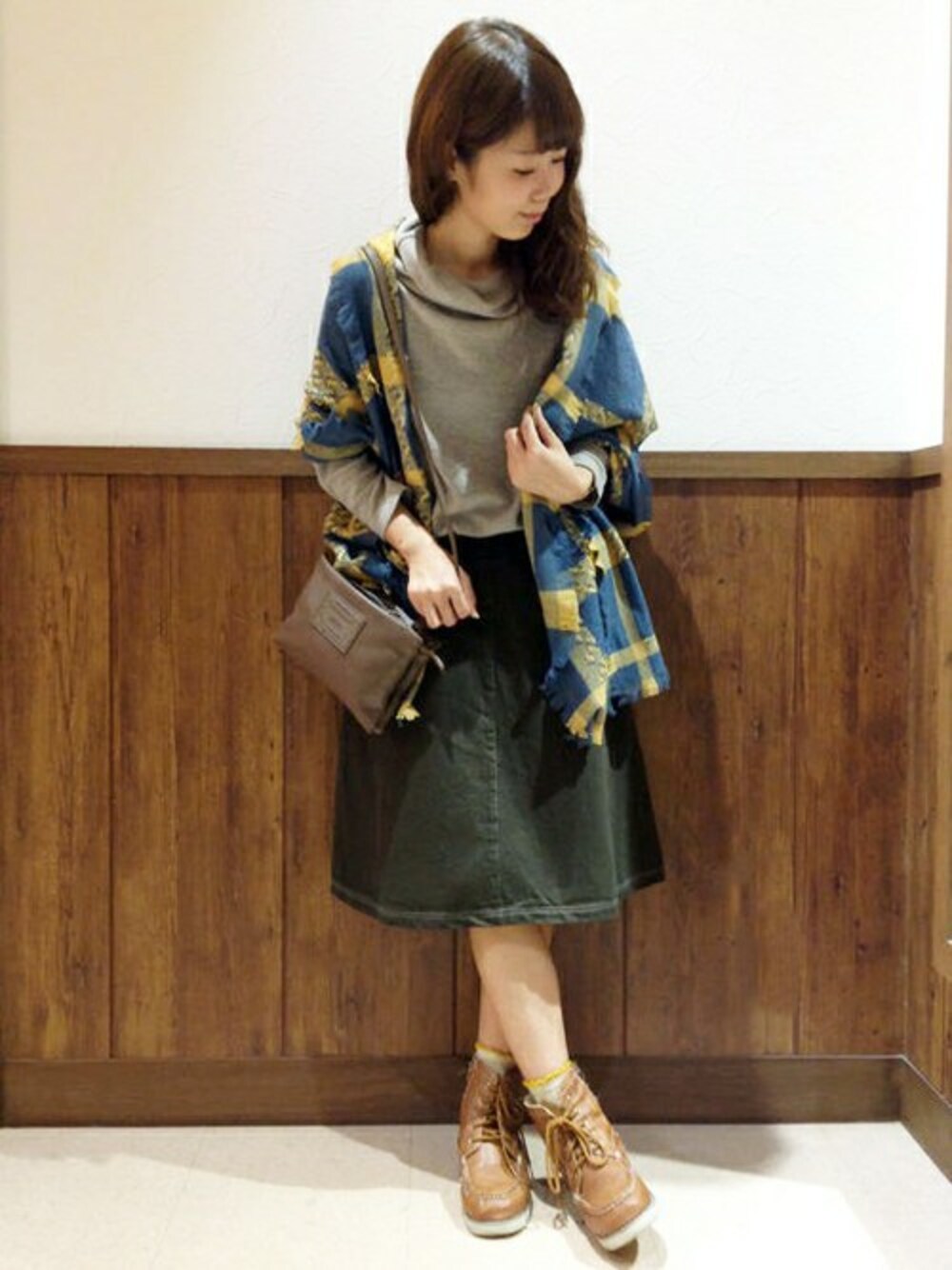 ベージュ×カーキのシンプルスタイルに、チェックストールをプラスした秋のコーディネート。 柔らかな起毛素材のオフタートルネックは、ふんわりとした女性らしいシルエットが特徴です。 ストールは、カラーとフリンジがフォークロアな雰囲気。さっと肩掛けするだけで今年らしい着こなしになります♪