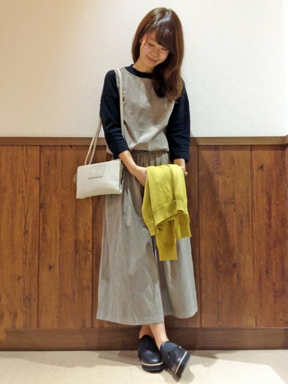 シックな大人カジュアルコーディネートです。 サロペットは、柔らかくしっとりとした風合いで女性らしい雰囲気。 ボトムス部分がガウチョのようなワイドシルエットでトレンド感のあるデザインです。 プチハイネックのインナーとあわせるとさらに今年らしくなります♪