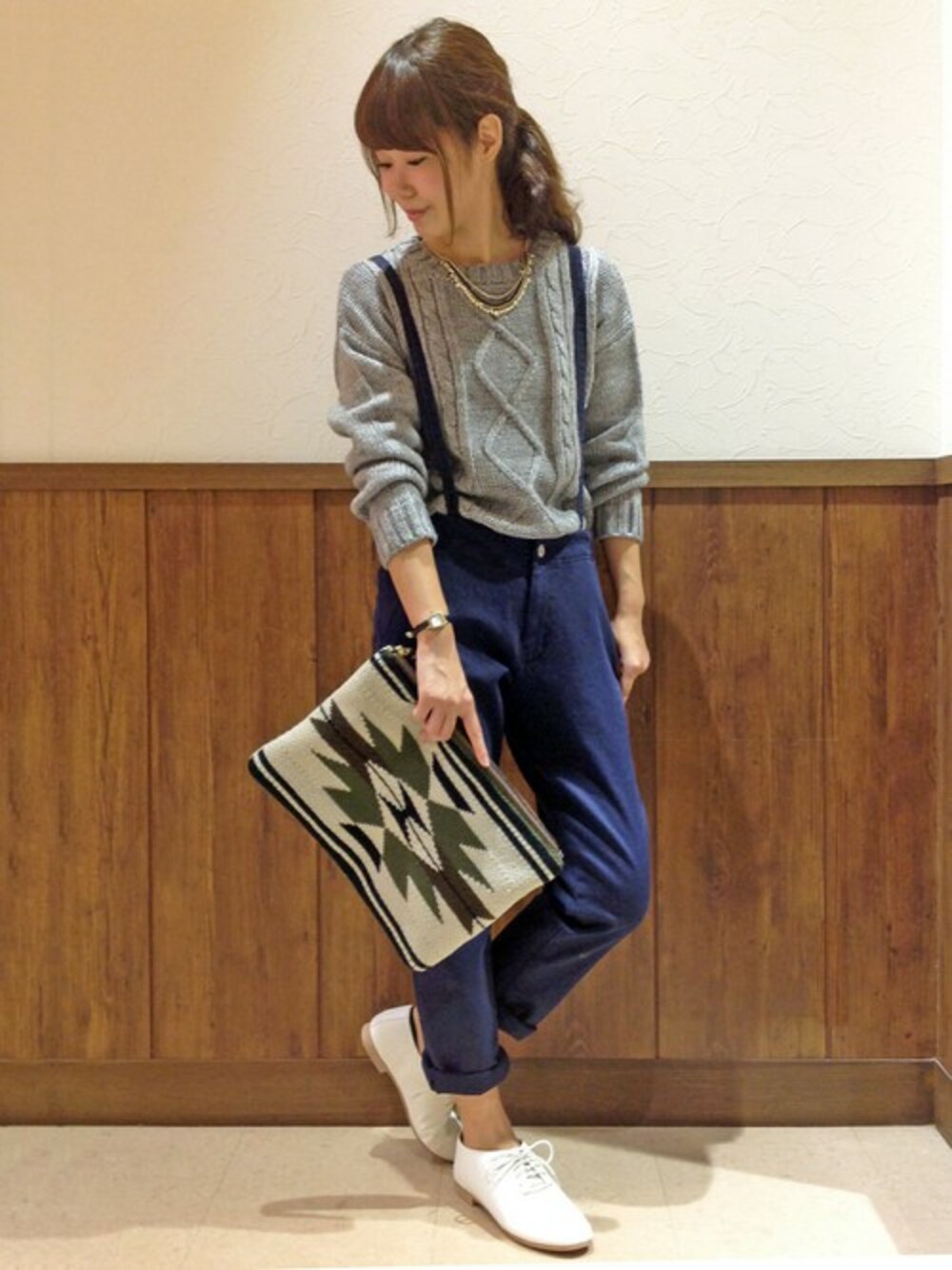 シンプルながらもさりげなくトレンドをとりいれたパンツスタイル。 履き心地のいいストレッチ入りのパンツは、とりはずしのできるサスペンダーがついてこなれた雰囲気。 ざっくりとしたケーブル編みが可愛いニットを、ゆるめのトップスインであわせてラフにスタイリングしました。 レースアップシューズやネックレスをあわせると大人の女性らしさがUPします♪