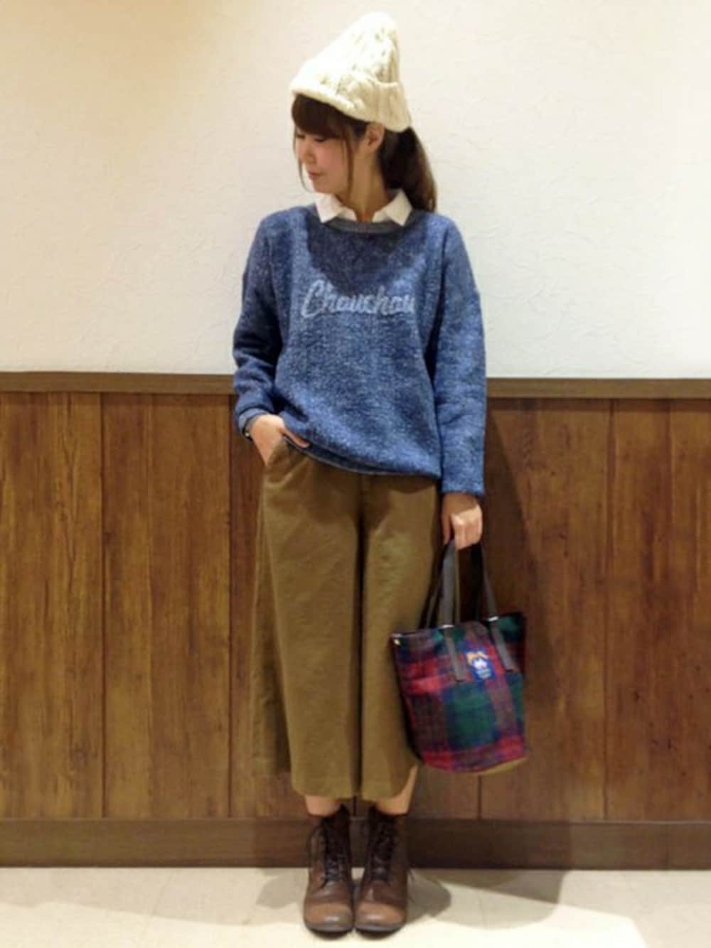 やさしいカラー合わせがポイントのカジュアルコーディネートです。 トレンドのロゴニットは、ニットのやさしい風合いとロゴ入りのラフな雰囲気をミックスしたデザイン。 インにシャツをあわせると今年らしさがUPします♪