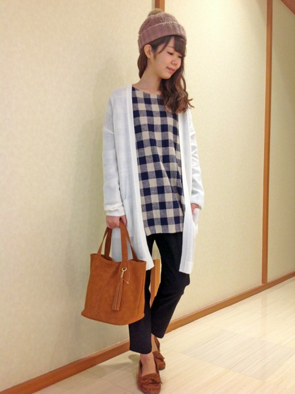 Iラインスッキリのパンツスタイルです。 ロング丈のトッパーは、ボタンなしで着回しやすさ◎ ブロックチェックのブラウスも、長めの丈で気になるヒップまわりをカバーしてくれます♪