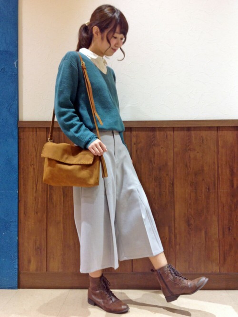 通勤にもおすすめのきれいめスタイルです。 スカートとガウチョの間のような感覚で穿けるフロントタック入りのスカウチョは、、ガウチョパンツの楽々な穿き心地はもちろん、ミモレスカートのようなフェミニンな雰囲気です。 そして、ハイネックと並ぶトレンドとなっているVネックのニットプルオーバーは、柔らかい素材感が特徴で、春を意識した明るめグリーン。 今回はボトムにインしていますが、ゆったりとしたシルエットでスリムボトムとの相性も◎です。