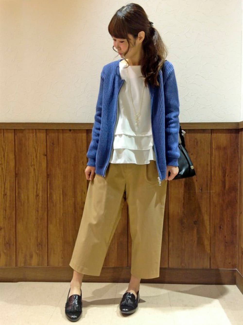 通勤にもおすすめのきれいめコーディネートです。 ホワイト×ベージュのやさしいカラーにブルーのジップカーデをあわせてポイントに。 小物は、黒で統一してきちんと感をプラスしました♪
