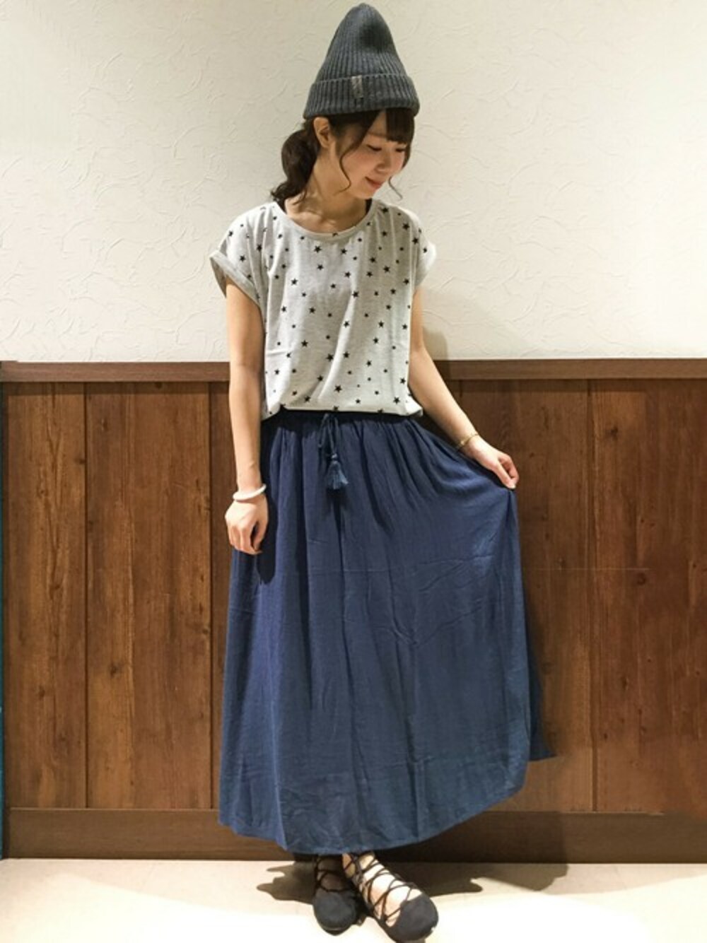 ニット帽を使った秋見えコーディネート。 注目のスターモチーフを取り入れ、今年らしさ◎ 深みのあるブルーのスカートと合わせ落ち着いた雰囲気にしてみました♪