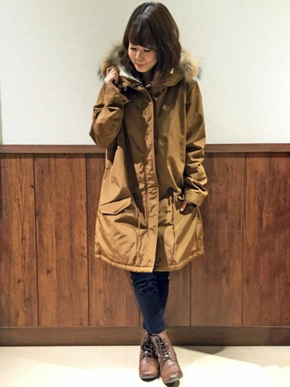 MANOのモッズコート「Eコットンフードボアファーコート」を使ったコーディネート