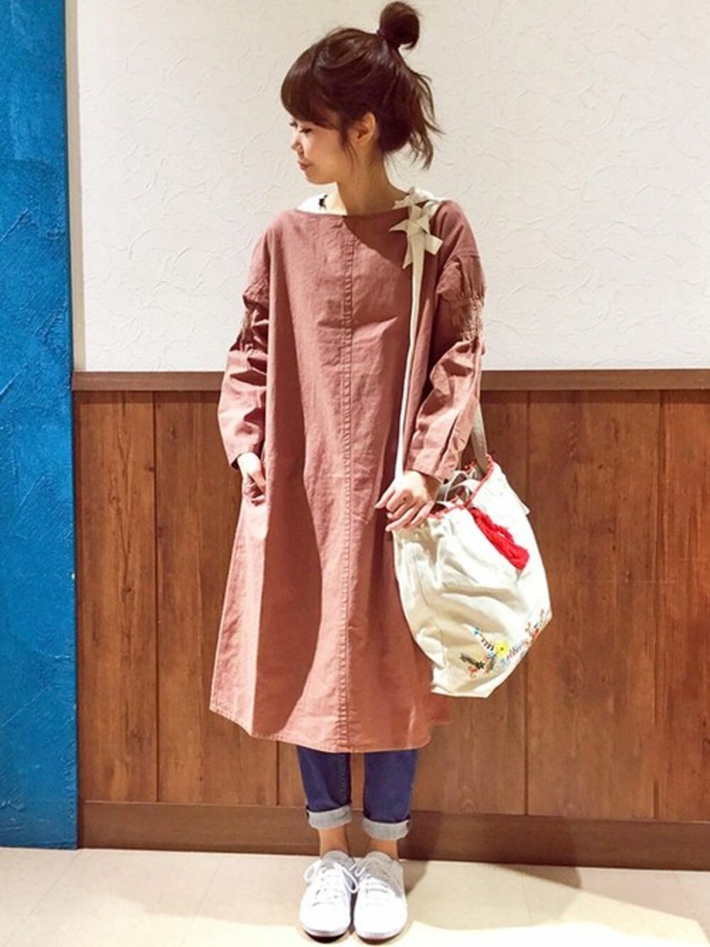 さりげなくネイティブを取り入れた春のワンピースコーデ。 トレンドの袖ボリュームをシャーリング刺繍で表現したワンピースは、シャーリング刺繍にはほんのりエスニックな雰囲気♪ 足元はスニーカーでカジュアルにまとめてみました。