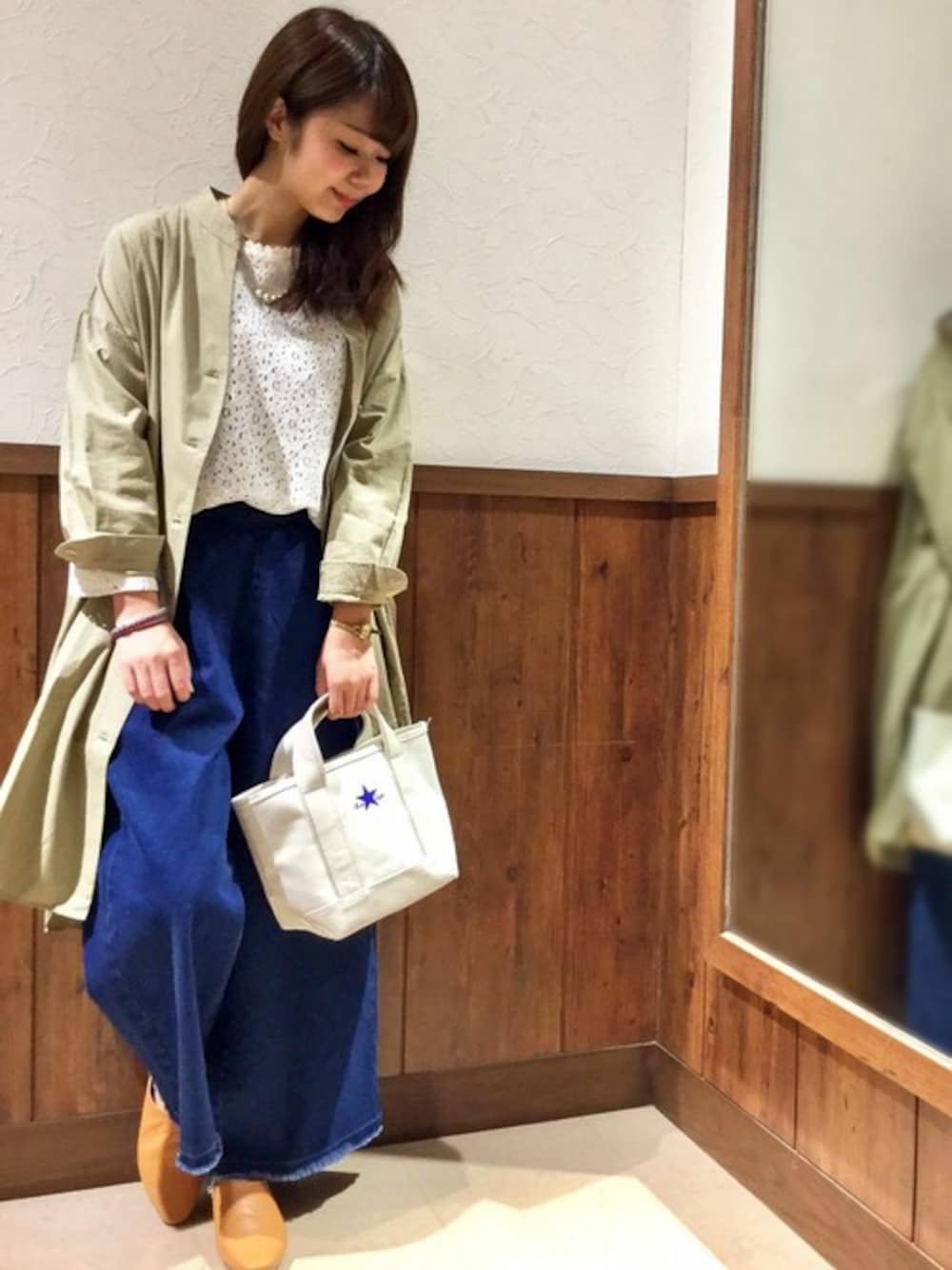 春のおすすめデニムコーデです。 微光沢のあるコットンポプリンのシャツワンピースは、羽織りとしても活躍する一枚。 前後差のある着丈とざっくりなサイドスリットは、パンツスタイルにもぴったりです。 小物とインナーは白でまとめて春らしさUP♪