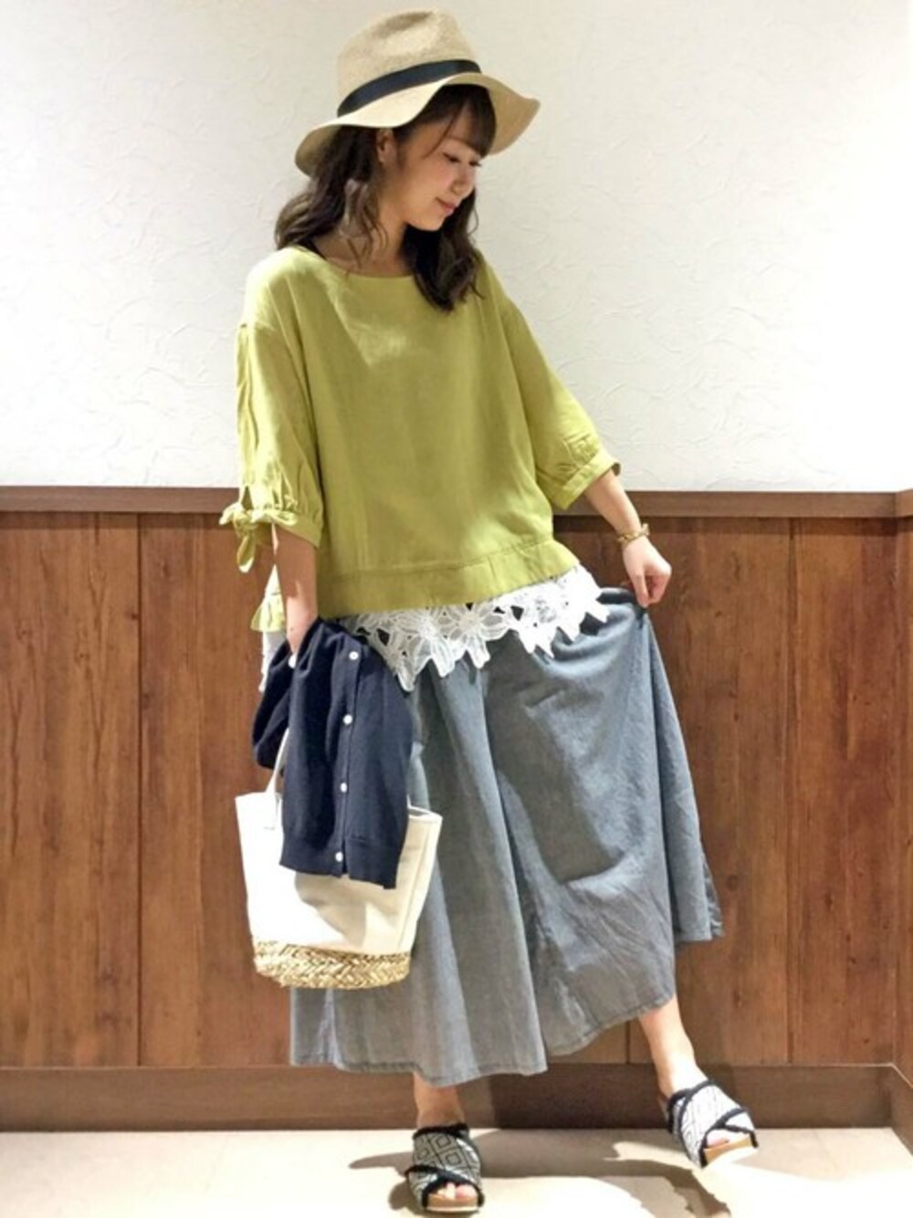 GWのおでかきにおすすめなラクチンコーデ。 立体的な裾レースがポイントになったフェイクレイヤードのブラウスは、一枚で着てもレイヤードしたようなバランス上手なコーディネートが完成する優れもの♪ 夏素材の小物たちでリゾート感をプラスしました♪